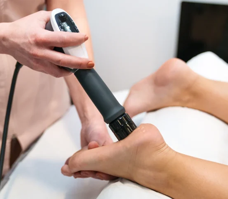 Uses high-energy sound waves to treat stubborn foot/heel pain like Plantar Fasciitis, Achilles Tendinitis, and heel spurs by stimulating natural healing, increasing blood flow, breaking down scar tissue, and reducing inflammation making it a non-invasive option for chronic issues unresponsive to other treatments, with sessions typically lasting 10-15 mins and requiring a few weekly sessions for best results.